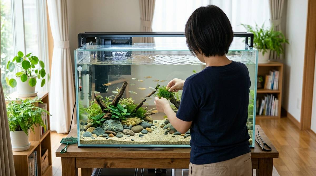 設置場所を決める際は、直射日光が当たらない場所を選ぶのが鉄則です。窓際に置くと日光によって急激に水温が上昇し、魚が弱ってしまうだけでなく、コケが大発生してメンテナンスが困難になります。また、水換えの作業をスムーズに行うために、水道からの距離や排水のしやすさも考慮しておくと、日々の管理が格段に楽になります。